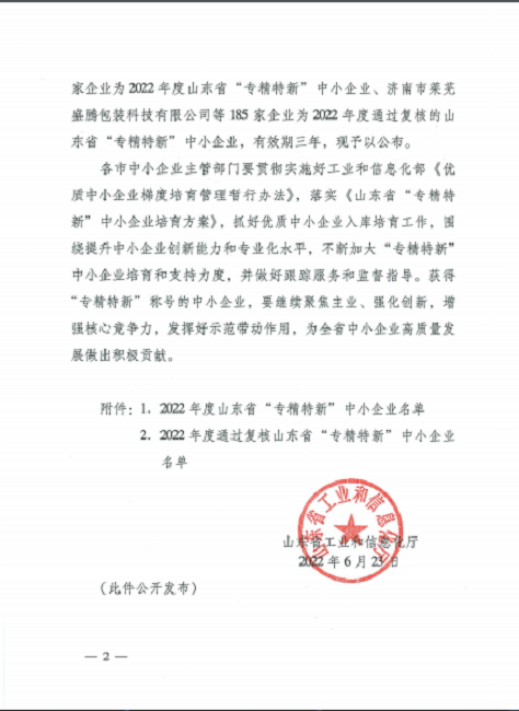 關于公布2022年度山東省“專精特新”中小企業的通知